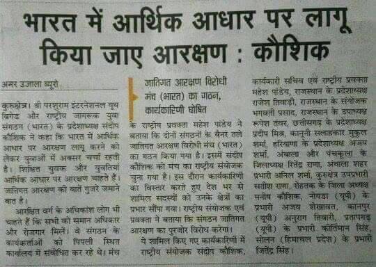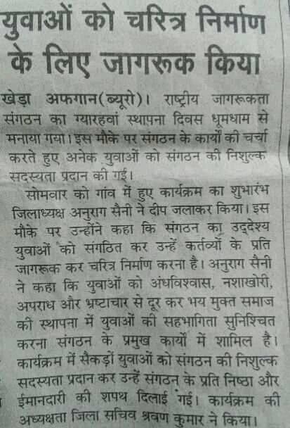 देश भर में समाज में फैली बुराइयों जैसे नशाखोरी, अपराध, अन्याय, अत्याचार एवं भ्रष्टाचार के विरूद्ध आवाज उठाने, युवाओं को संगठित कर आपसी सहयोग की भावना उत्पन्न करना